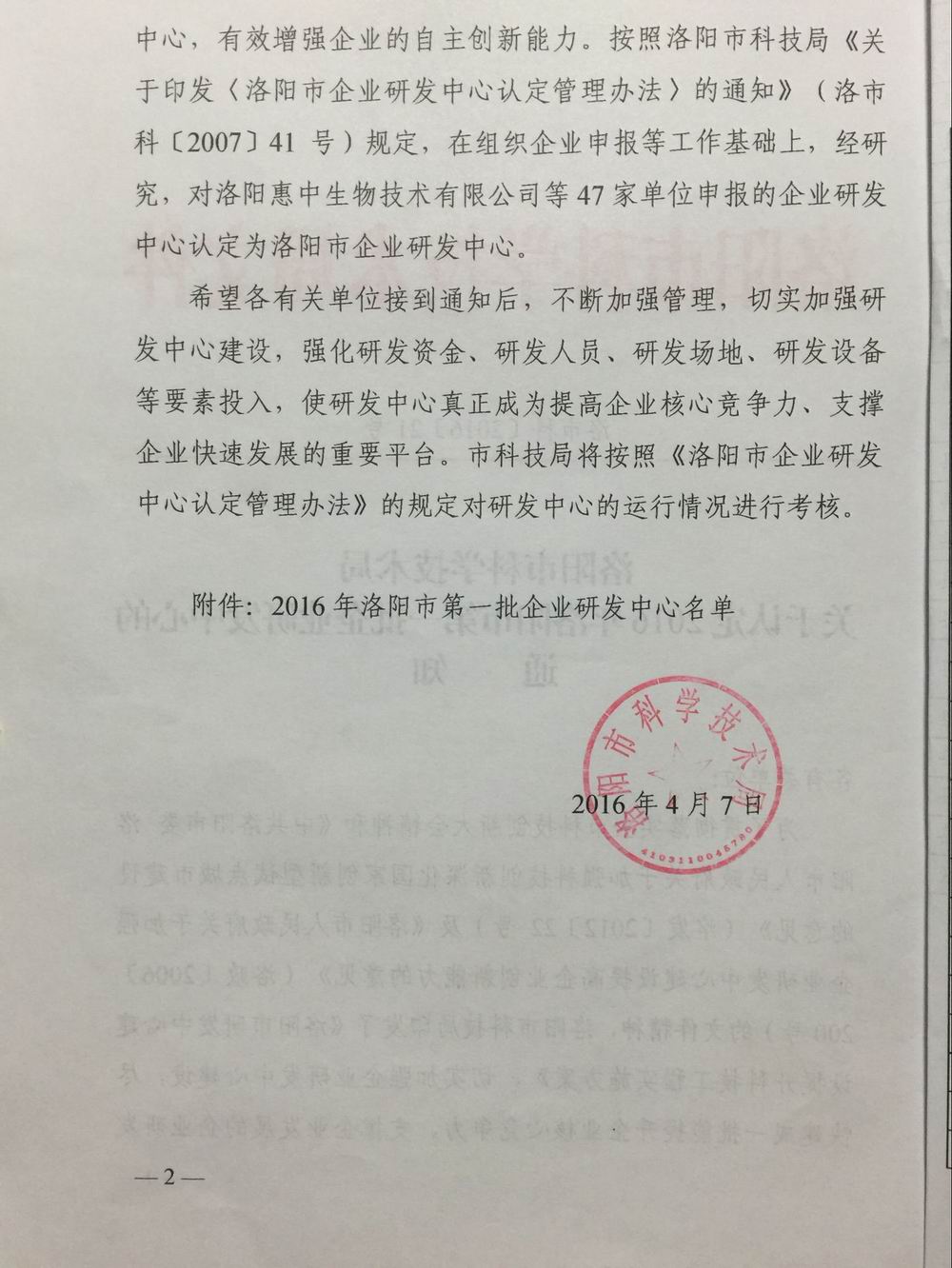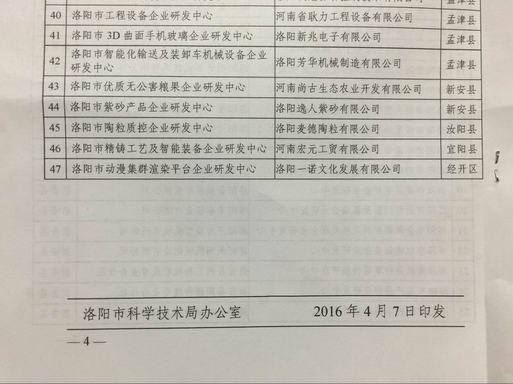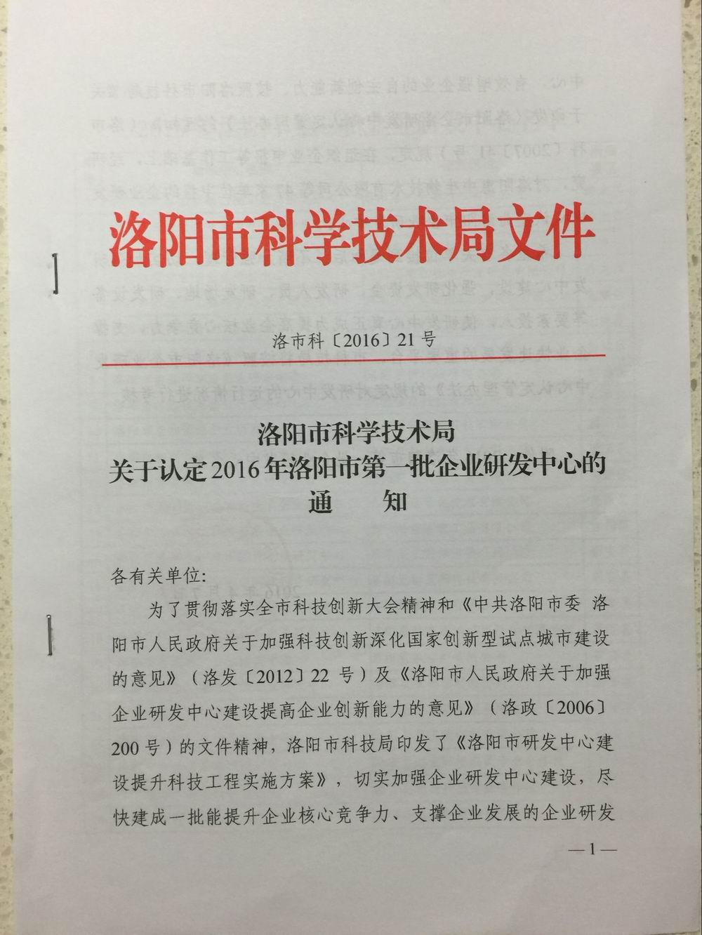 洛陽市科學技術局今日下發了《關于認定2016年洛陽市第 一批企業研發中心的通知》,隨著通知的下達,我司企業研發中心正式成立!